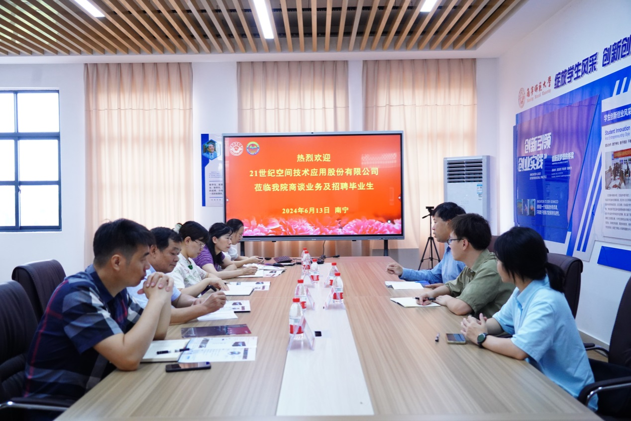 座谈会上,南宁世纪空间技术应用有限公司市场经理王井英从公司简介、产品背景、主要内容、产品特色几方面介绍了实景三位地理教学平台,与学院还分别就甘蔗遥感监测科研项目及共建实习基地进行了洽谈。