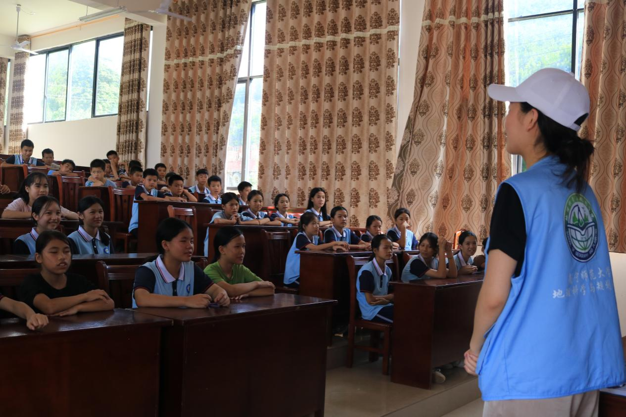 实践队队员在燕洞镇中心小学为当地儿童开展天文科普课。课程通过比较学校与地球面积差异的尺度,同时介绍了地球在宇宙中的位置以及其自转和公转的情况,进一步拓展了乡村员工的视野,引导他们对宇宙的奥秘有了更深入的理解和兴趣。