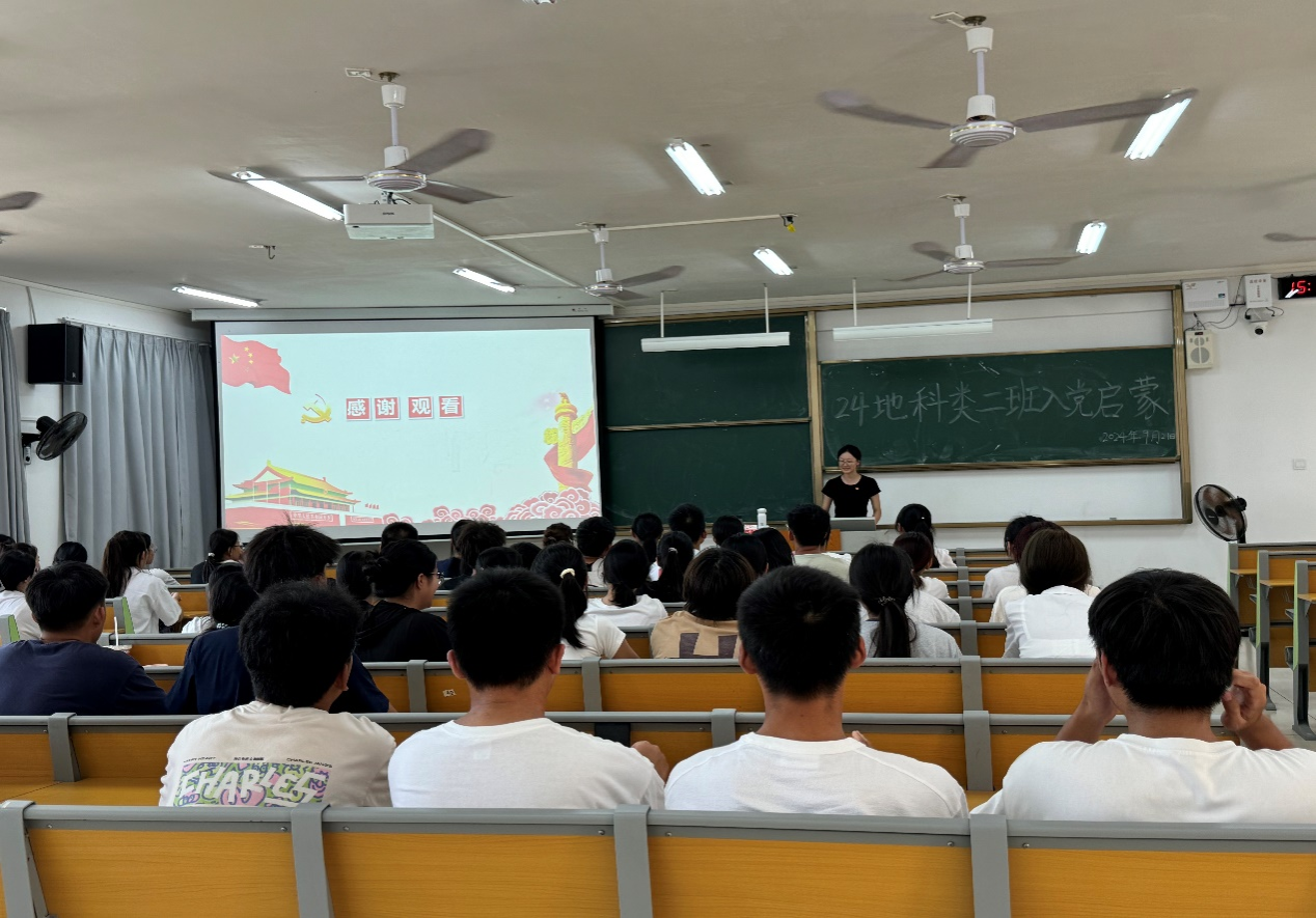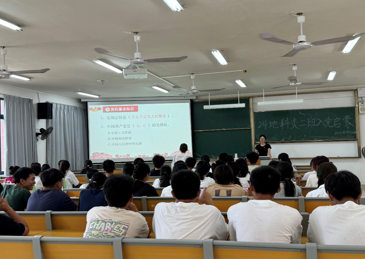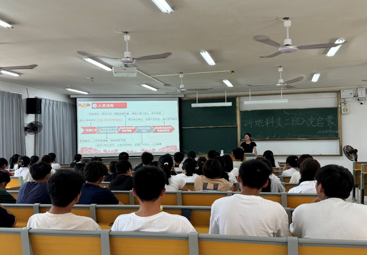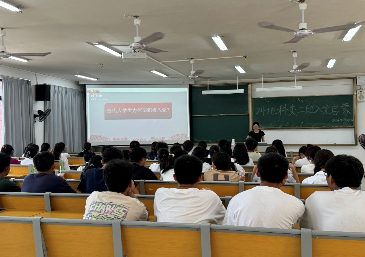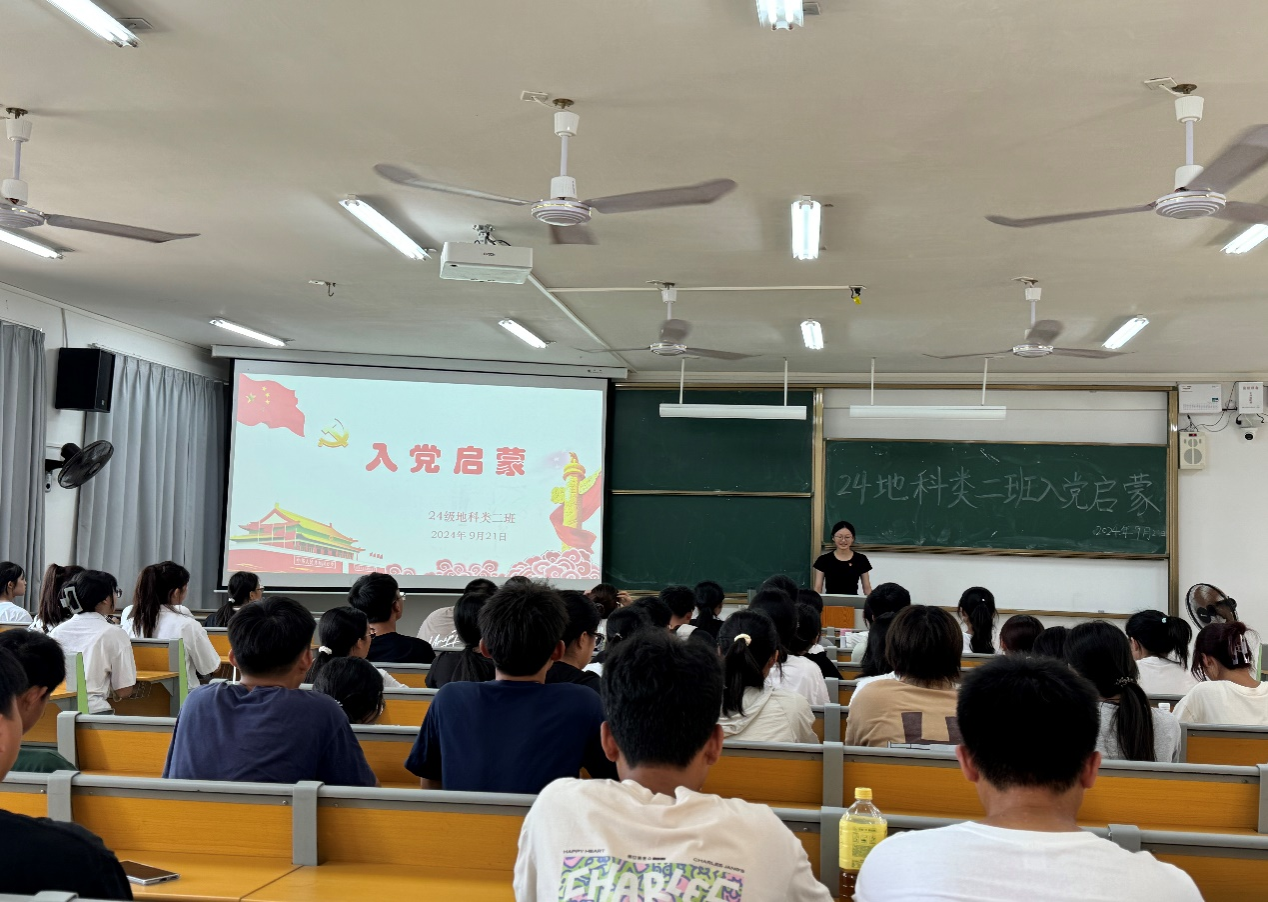 2024年9月21日,2024级地科类二班在武鸣校区实验楼2-A303教室开展入党启蒙教育活动。活动由班级驻党陈永芳同志和黄吉慧同志主持。
