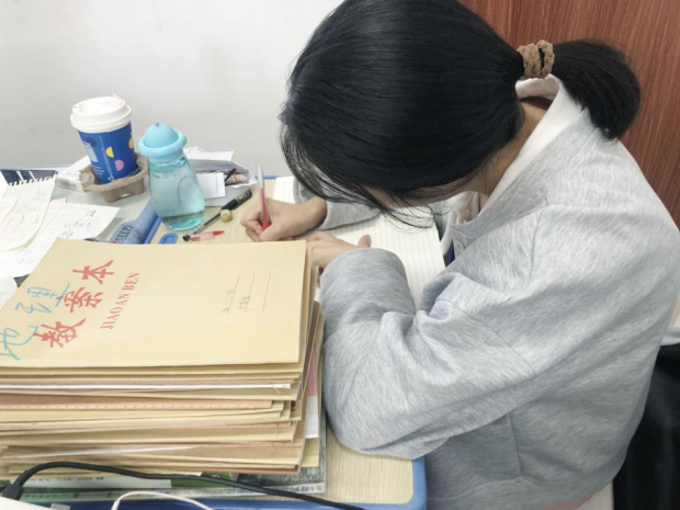 (图/实习老师黄玉萍在批改作业)