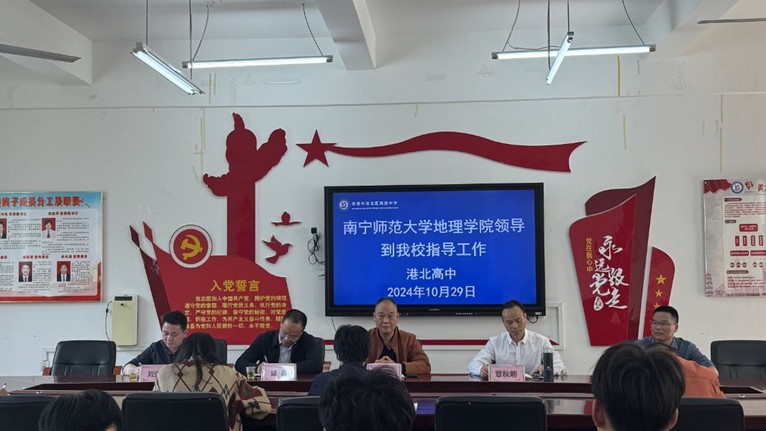 2024年10月29日上午,威廉希尔中文官网教师团队来到港北高中进行实习生工作中期检查,在综合楼二楼党员活动室开展两校交流会。本次会议由贵港市港北区高级中学副董事长顾全坚主持,高一地理组全体教师和全体实习老师共同参会,出席本次会议的领导有贵港市港北区高级中学覃秋明书记、地理科学与规划党委书记严志强老师、党委副书记盛凯老师、刘立昌老师。