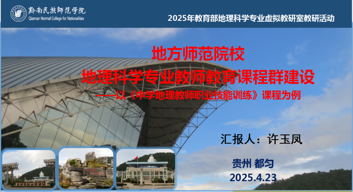 黔南民族师范学院许玉凤老师以“地方师范院校地理科学专业教师教育课程群建设——以《中学地理教师职业技能训练》课程为例”为主题,分享了该校地理科学专业教师教育课程群课程设置情况以及课程支撑毕业要求指标点的情况,并以《中学地理教师职业技能训练》课程为例,从课程目标、课程内容、课程实施、课程评价等几个方面介绍了该课程的建设成效。