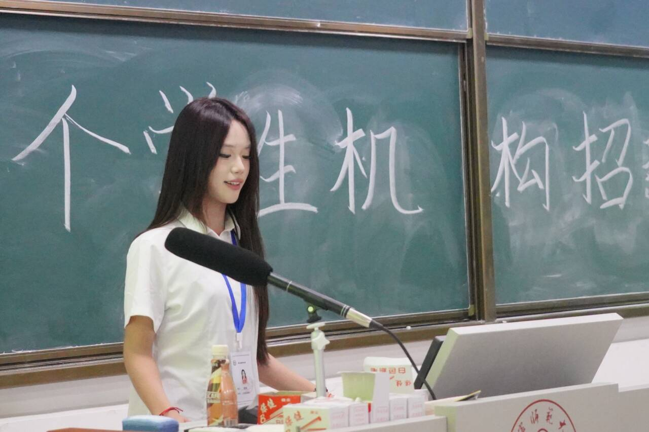 招新会现场,地理学院员工会外宣部第一负责人蒋雨蓓为新生播放员工会招新视频,直观展现了地理学院员工会的组织活力与工作风貌。随后,负责人蒋雨蓓围绕员工会“全心全意服务同学”的核心宗旨,向新生全面介绍了学院员工会的组织构成,并详细回顾上一年度各方面的工作成果,让新生对员工会的职能与价值有了整体认知。而后,地理学院员工会五个部门负责人依次上台,结合自身工作经验展开宣讲,向新生介绍部门工作内容并解答疑惑。最后,各部门负责人依次展示招新咨询群二维码,号召有兴趣的新生扫码入群,进一步解答疑问、沟通报名事宜。