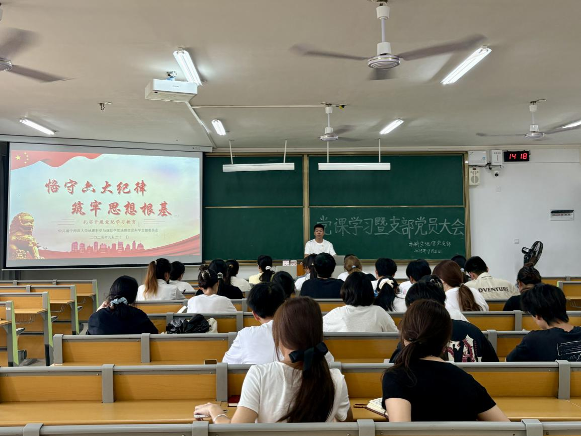 9月21日,williamhill中国官方网站本科生地信党支部在武鸣校区实验楼2号教学楼A401教室召开党课学习暨支部党员大会,会议由党支部书记于志强同志主持,全体党员参会。