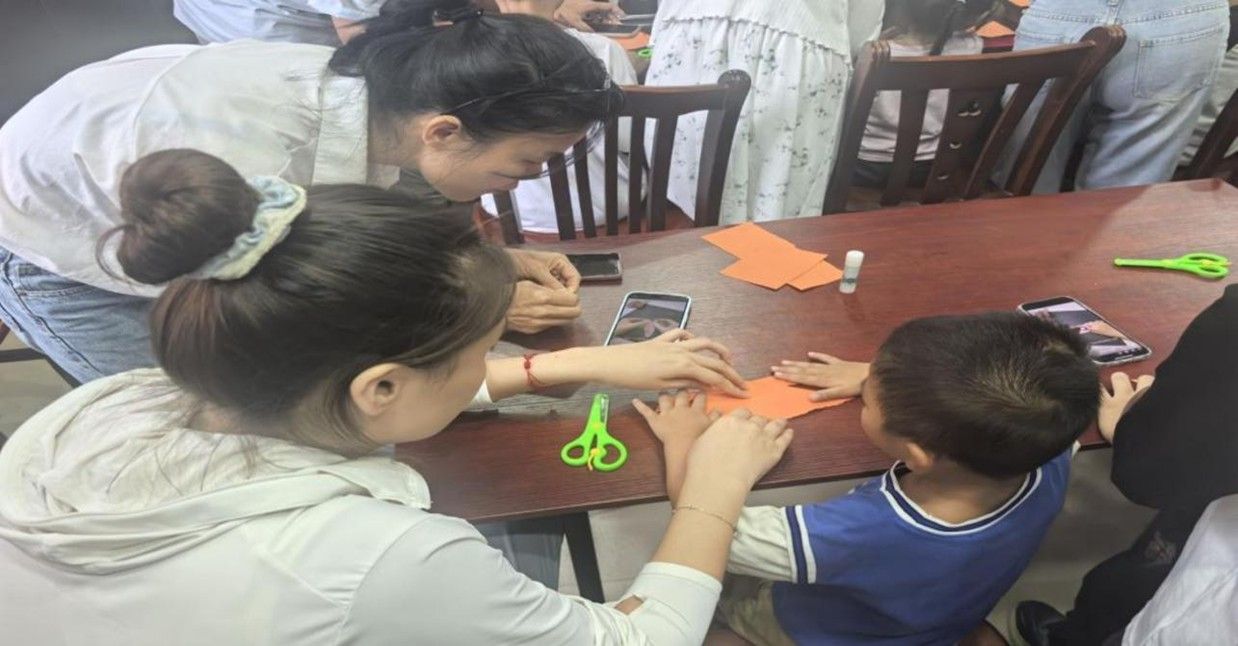 活动伊始,志愿者通过生动有趣的讲解和互动问答,向小朋友们介绍了祖国壮美的大江大河,内容涵盖河流的成因、地理特征、分布规律及其对人类活动的影响,同时也普及了与河流相关的安全知识。志愿者还引导小朋友们思考河流的起源及其在自然界中的作用,帮助他们深入理解河流生态系统,增强环境保护意识。随后,志愿者协助小朋友利用卡纸、订书机等工具制作手工乌篷船,在制作过程中,志愿者们通过互动交流引导孩子们探讨河流的功能与价值,激发他们对活动的持续兴趣,深化对“河流”主题的理解。紧接着,孩子们在志愿者的指导下,使用双面胶、卡纸、水彩笔等材料制作仿真的卡纸小池塘。这一环节使小朋友们更加直观地认识到池塘与河流之间的生态联系,不仅帮助他们构建起对河流流域的整体性认知,也有效激发了想象力和动手能力。之后,志愿者通过卡纸接龙的方式组织了一场关于河流利弊影响的问答比赛。游戏不仅加深了孩子们对河流双重作用的理解,也锻炼了他们的反应能力和团队协作精神。活动最后,小朋友们手举自己的手工作品,与志愿者们合影留念,为本次活动画上圆满句号。