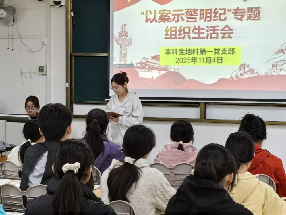 11月4日晚,williamhill中国官方网站本科生地科第一党支部在武鸣校区1号教学楼220教室顺利召开“以案示警明纪”专题组织生活会。此次会议由预备党员区俊如主持,指导老师盛凯出席,党支部全体党员参加。