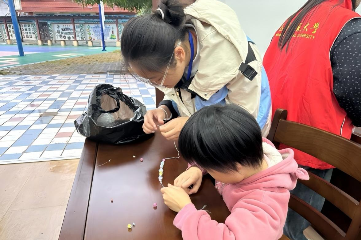 (志愿者与小朋友进行串珠游戏)