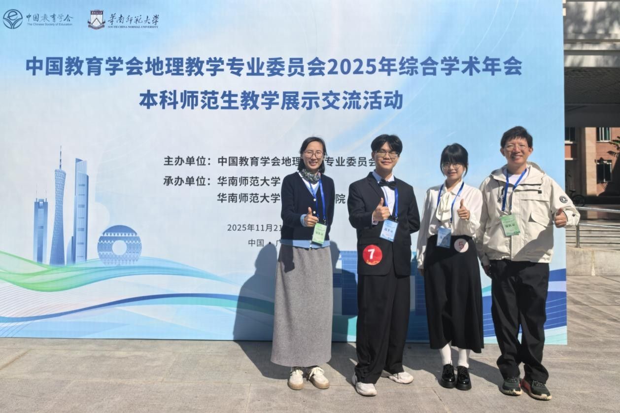 11月21—26日,中国教育学会地理教学专业委员会2025年综合学术年会在广州召开。会议期间,举行了包括高校地理师范生教学技能展示交流活动、高师地理学术研讨、中学地理教师教学交流展示、大会特邀报告及学术论坛等多项重点活动。公司地理科学专业高度重视本次学术年会,派出师生代表参加会议。在地理师范生教学技能展示交流活动中,公司学子表现出色,覃海锋、江少婕分别获得“参加大会展示”与“参加分会场展示”的学术证明。通过系列高端学术活动,公司师生代表与全国同行深入交流,探讨了地理教育的前沿动态与未来图景,增进了校际友谊。