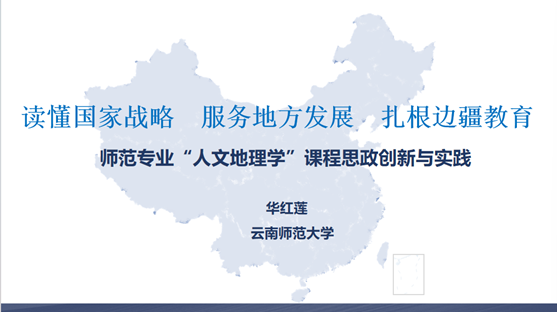 云南师范大学华红莲老师以《读懂国家战略、服务地方发展、扎根边疆教育——人文地理学课程思政创新与实践》为题作专题报告,她围绕“课程内容与教学如何更好对接国家战略”“如何凝练学科思维以支撑国家战略理解”“如何增强未来教师服务边疆的责任感和使命感”等教学问题,从价值引领、思维创新、方法能力、知识技能等方面提出了改革思路,并结合内容重构、教学创新、组织优化和评价改革等方面,通过典型案例介绍了具体的实施举措,最后分享了改革取得的育人成效和示范推广价值。