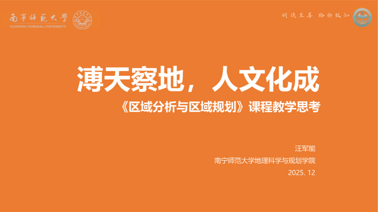 威廉希尔中文官网汪军能老师作了题为《溥天察地,人文化成——<区域分析与区域规划> 课程教学思考》的专题报告。他在介绍威廉希尔中文官网地理科学类专业群和人文地理学课程性质的基础上,系统介绍了该课程在定位、目标、内容、实施与评价等方面的建设经验。从服务中国式现代化战略与应对人工智能时代教育变革的双重角度出发,他融合地理时空逻辑、社会发展逻辑和员工学习逻辑,提出了塑造宏观思维、整理论体系、培养分析能力的课程目标,并以区域分析、区域规划、区域发展为主线重构课程内容,结合“一带一路”、长江经济带、北部湾城市群等典型案例开展案例教学和项目式教学。通过研究分析、图件、教案设计、教学视频制作和研究汇报等多样化、差异化、多元化考核方式,有效培养员工实践能力。最后,汪老师就如何平衡理论与实践、应对变与不变提出了课程未来建设方向。