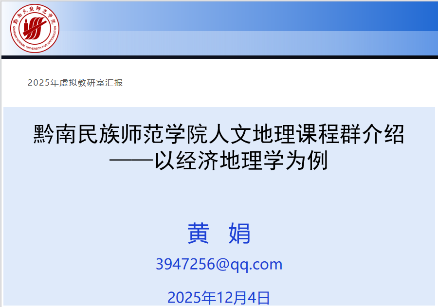黔南民族师范学院黄娟老师作了题为《黔南民族师范学院人文地理课程群介绍——以经济地理学为例》的报告,系统介绍了该校课程群在课程定位、课程目标、课程内容、课程实施、课程评价、课程特色与展望等方面的建设经验。她重点分享了如何通过“点—线—面”联动的实践教学体系,将课程实践、野外实习与地方产业发展相结合,培养员工的地理实践力与综合思维。黄老师还展示了如何依托三线建设博物馆、少数民族工艺村等地方资源开发乡土课程,有效促进了高等教育与基础教育的衔接。