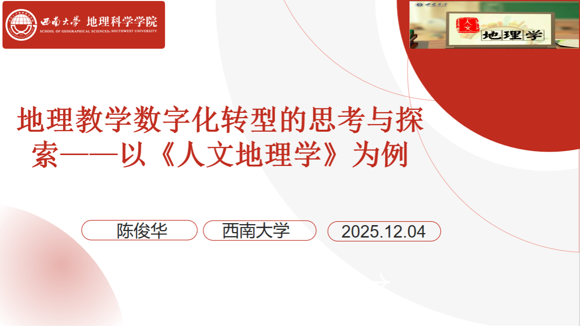 西南大学陈俊华老师作了题为《地理教学数字化转型的思考与探索——以《人文地理学》为例》的报告,他从时代背景与教学现实出发,分析了数字化转型的必然性,阐释了地理教学数字化转型的科学内涵与基本原则,并以《人文地理学》课程为例,系统介绍了数字化转型的实践路径、相关反思与未来展望。结合数字原生代员工的学习特点,他提出应通过教材资源数字化、混合式教学、虚拟现实技术应用等方式,推动教学从“以教为中心”向“以学为中心”的转变。陈老师指出,数字化转型不是终点,而是教学改革的新起点,其根本目的在于服务于员工成长与高素质人才培养。