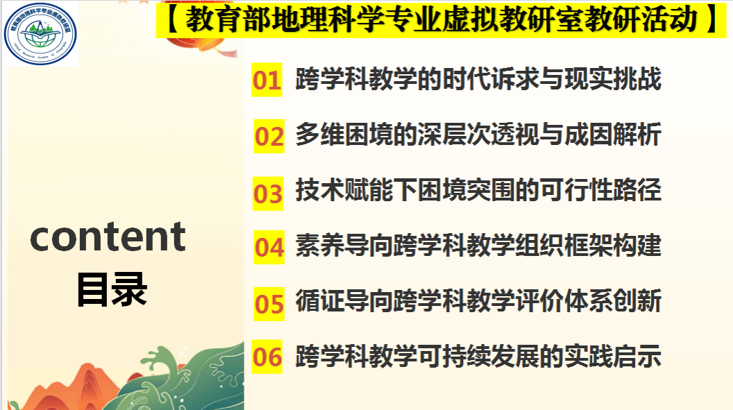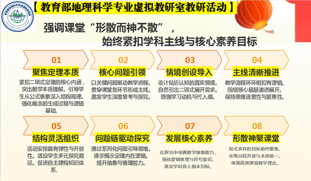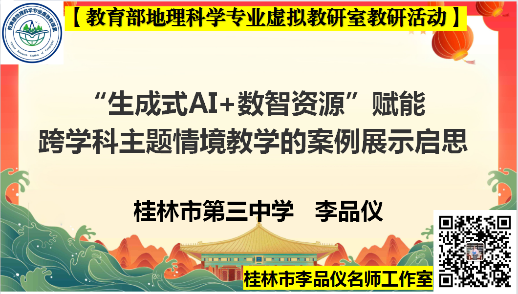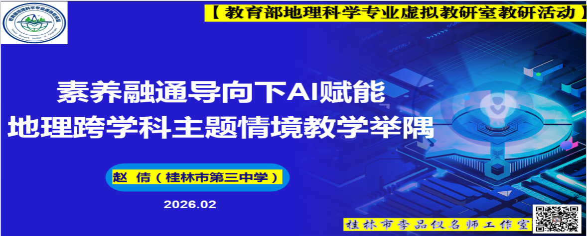 教育部地理科学专业虚拟教研室始终以“聚焦虚拟教研,促进协同育人”为核心,依托威廉希尔中文官网地理科学国家一流专业、国家一流课程等平台,联合西南大学、云南师范大学、贵州师范大学、重庆师范大学等西南地区 11所高校及 2 家企业,构建了跨区域、全覆盖的“智能 +”教研生态。 2026年2月5日晚,该教研室教研活动在线上顺利开展,聚焦“数智化赋能‘1+X’跨学科主题教学”。此次活动由桂林李品仪名师工作室承办,李品仪、田丰、赵倩三位老师带来精彩讲座,为地理“1+X”跨学科融合与技术赋能实践提供了宝贵经验。活动吸引全国多地师生在线参与,生动践行了虚拟教研室“课程共建、资源共享、团队共培”的建设理念。