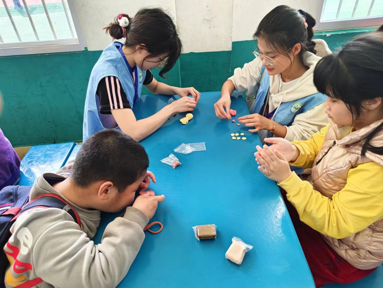 活动伊始,小朋友们在志愿者的引导下,进行名为“胶泥塑型”的游戏,每个志愿者与两位小朋友一起用胶泥创造出各种奇妙的事物。紧接着,志愿者与小朋友们一起进行了“飞扬沙包”和“老鹰捉小鸡”的游戏。每一位小朋友都玩得很开心,所有人的脸上都洋溢着快乐的笑容。不仅如此,志愿者们还和他们一起进行篮球、排球等球类友谊赛。简单而充满趣味的游戏和友谊赛,让校园内洋溢着轻松愉悦的氛围,欢乐与祝福交融,成长与祝愿交织,小朋友们用欢乐释放爱意,尽情享受着快乐时光。