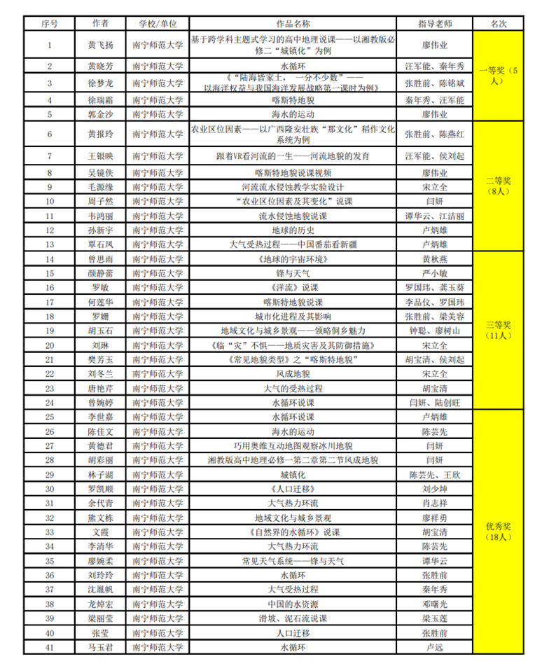 2024年1月12日,教育部地理科学专业虚拟教研室联合《地理教育》编辑部以及北京中教启星科技股份有限公司北斗启星网络地理社区举办的首届地理说课大赛获奖名单已公布。本次比赛共收到来自全国各地中学教师、高校师生的作品744件,经国内地理教育专家、学者评审,共评出一等奖80份,二等奖151份,三等奖231份,优秀奖282份。