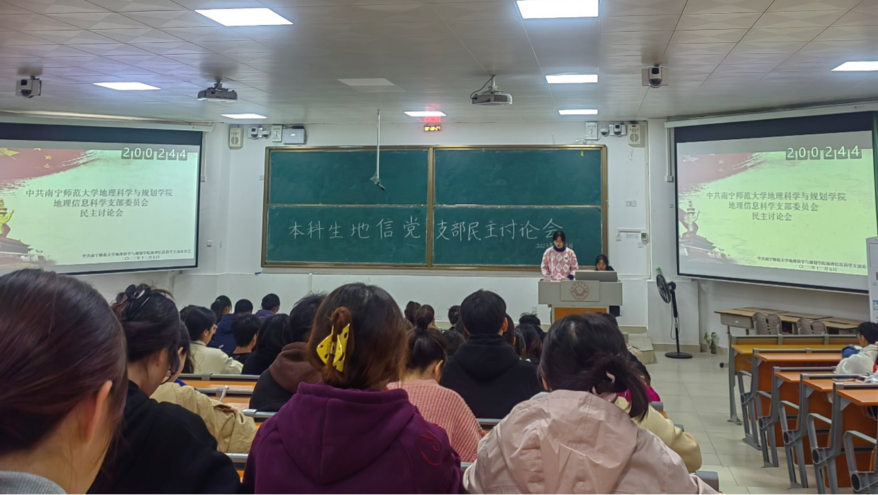 2023年12月5日星期二,williamhill中国官方网站本科生地信党支部在威廉希尔中文官网武鸣校区2号教学楼109教室如期召开民主讨论会。本次会议由綦文嘉同志和张子涵同志主持,本科生地信党支部全体党员和各班积极分子共同参会。