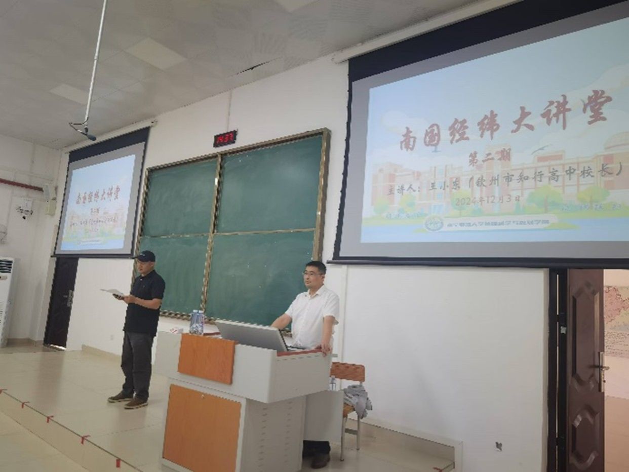 2024年12月3日下午在地源楼B-107,王小东董事长和毛秀英老师分别以《认识自己、把握自己、经营自己》和《“三新”背景下的优质课堂建设》的主题开展南国经纬大讲堂第二期的报告会。此次会议由地理科学系宋立全和韦晨主任策划,会议由地理科学系主任宋立全主持,地理科学系教师、大二至大四地理科学作业专业本科生及学科地理研究生参会。