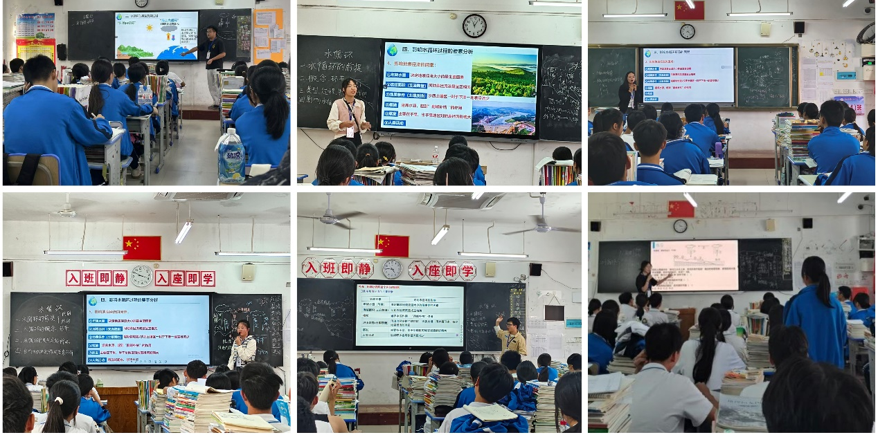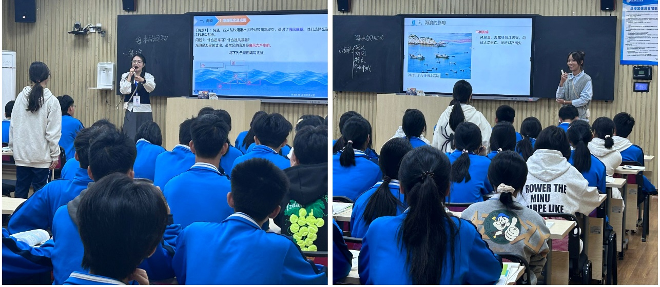 2024年11月5日、11月21日,带队老师莫海明和刘庆前后两次前往学校探望实习队伍,并对实习教师近期的教学成果进行检验和点评。评课采用实习生自评、实习小组互评、指导老师评价、带队老师评价等多种评价方式全面展开评价。两次评课带队老师及指导老师都对实习生的成长给予了肯定,并针对不同实习生的课堂给出了实质性的意见和建议。如莫海明老师指出对课堂思政以及乡土地理开发不足,讲到海水运动时,指出潮汐的概念在高中地理课本与大学所学的地球概论中的不同,将大学与高中知识联系起来,指出了高中课本知识的不严谨性,建议实习教师在教学过程中进行知识的补充和说明;刘庆老师指出可以从教师教学要素组合、教学弹性设计、课堂互动有效性、员工反馈评价等不同的角度进行教学优化;指导老师们指出可以从课堂承转、教材内容挖掘与拓展、员工兴趣引导等方面提高教学质量。