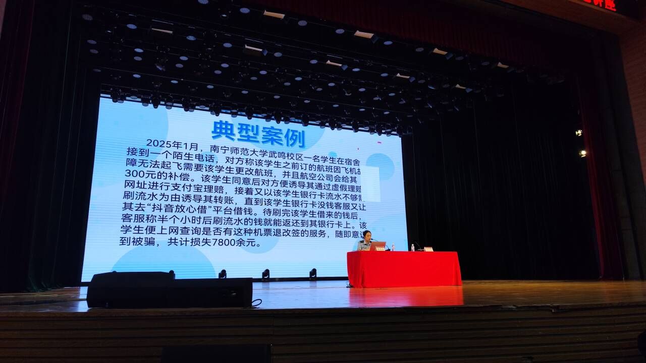 讲座现场,邓幸梓首先结合国家政策,简要介绍了国家资助政策,深入浅出地阐述了诚信教育的内涵、重要性。他呼吁同学们,要积极关注国家政策,响应国家号召,认真学习,践行诚信准则,回报社会。此外,邓幸梓还结合校园诈骗案例,介绍常见的诈骗手段,给出相应的提防建议。他强调,同学们在日常学习生活中应提高防范意识,认清诈骗手段,保护好自己的财产安全。