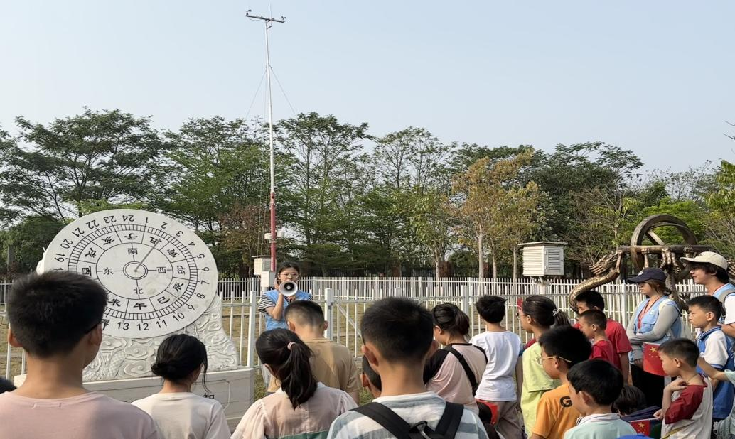 研学首站,青少年们在学院志愿者引导下参观了气象园,不仅了解室外温度测量器材的作用,并读取所显示的当日气温。而且也了解日晷的产生历史以及介绍科学原理和用途。