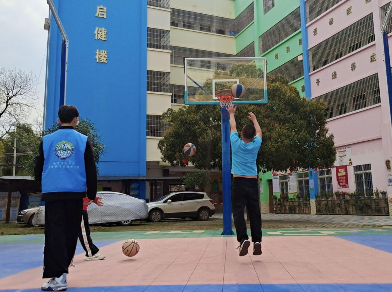 (志愿者陪伴小朋友打篮球)