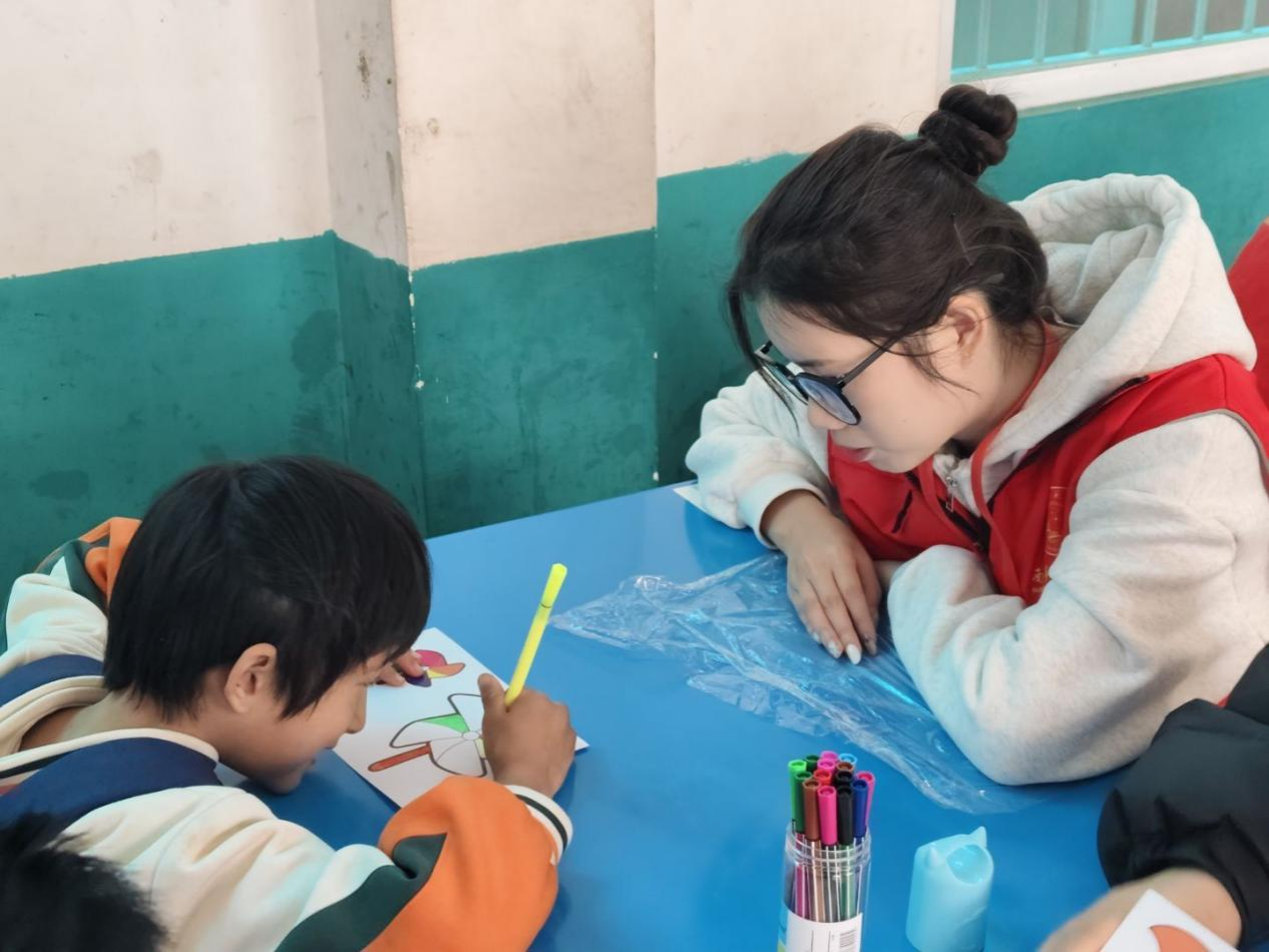 (志愿者陪伴小朋友进行涂鸦)