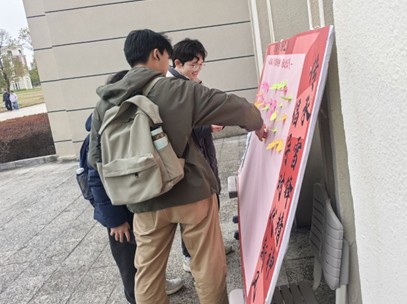 活动伊始,志愿者们满怀热忱,积极鼓励同学们参与活动。同学们积极地在便利贴上郑重写下对雷锋精神的深刻感悟、对身边好人好事的由衷赞美,或是自己践行雷锋精神的坚定承诺。在活动中,有一位同学写道:“雷锋精神,是一种永不退缩的进取精神。它鼓励我们要坚强勇敢,在逆境中奋起,在困难中拼搏。”那一张张承载着同学们真挚情感与正能量寄语的便利贴,被有序张贴在精心布置的展板上,汇聚成一片蔚为壮观的“爱心海洋”,成为了地源楼大厅里一道亮丽动人的风景线。最后,本次活动在一片欢声笑语中圆满结束。