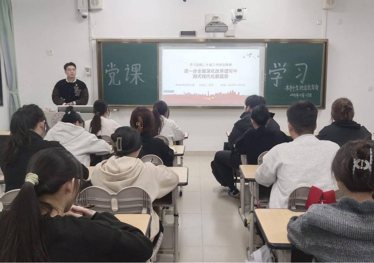 通过此次主题党课,本科生地信党支部全体党员对党的二十届三中全会精神有了深刻认识,将在以后的工作生活中全面贯彻深化改革的奋斗精神,为推进中国式现代化贡献力量。