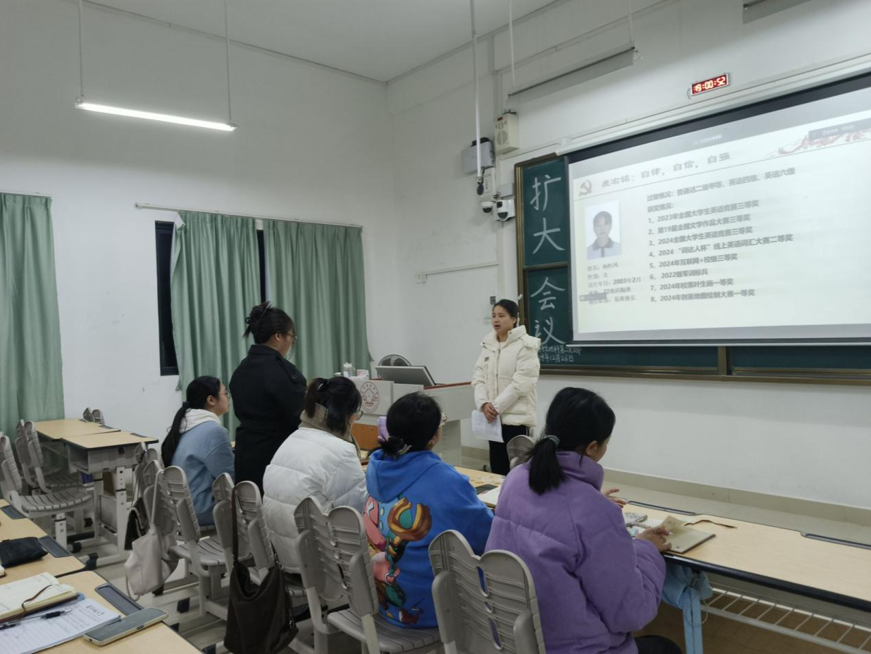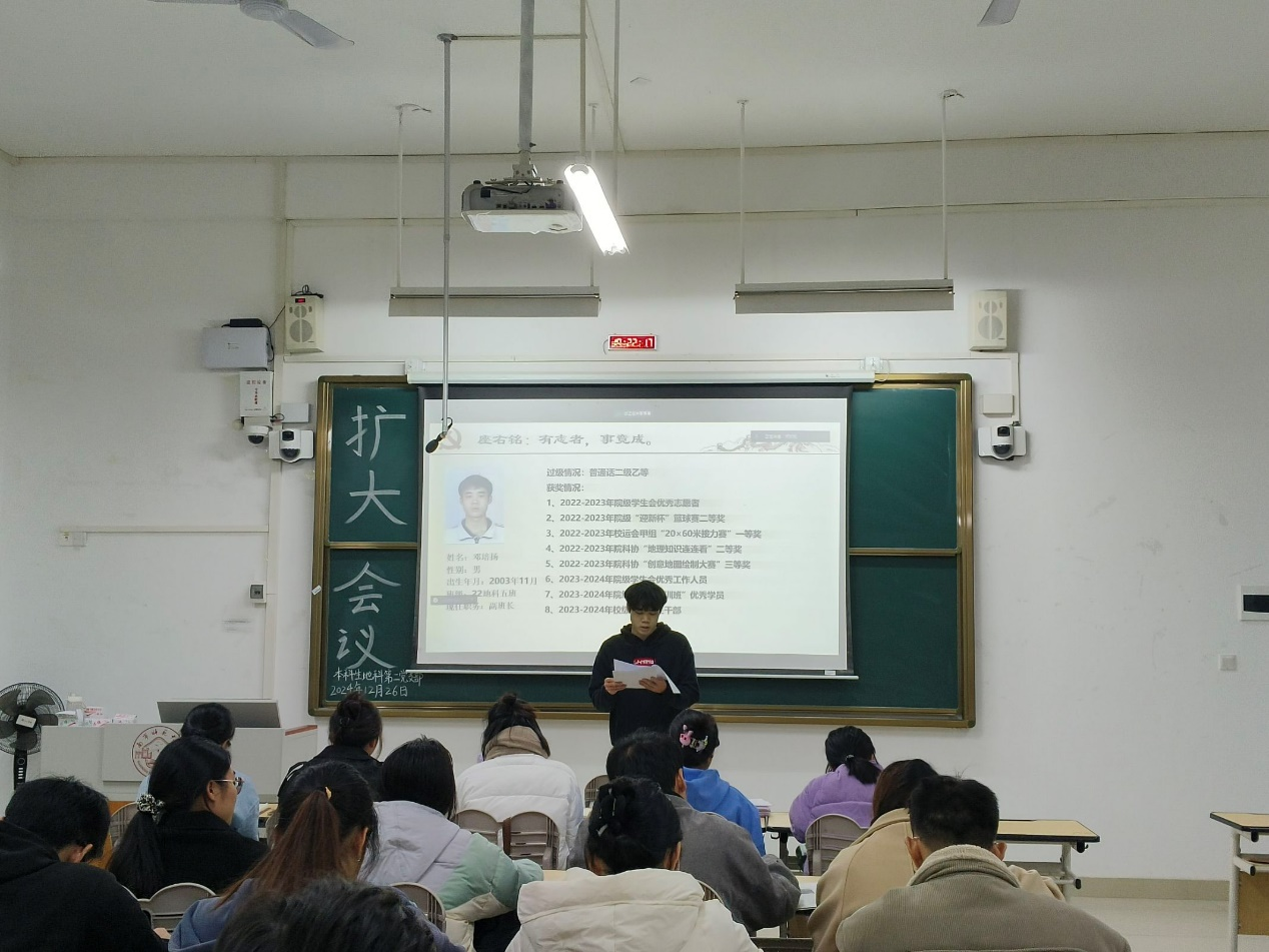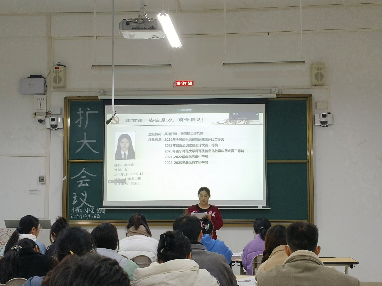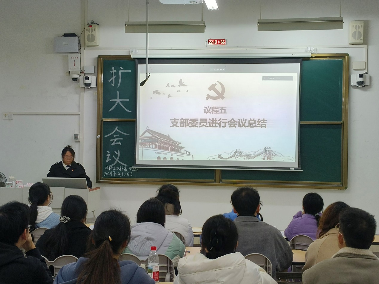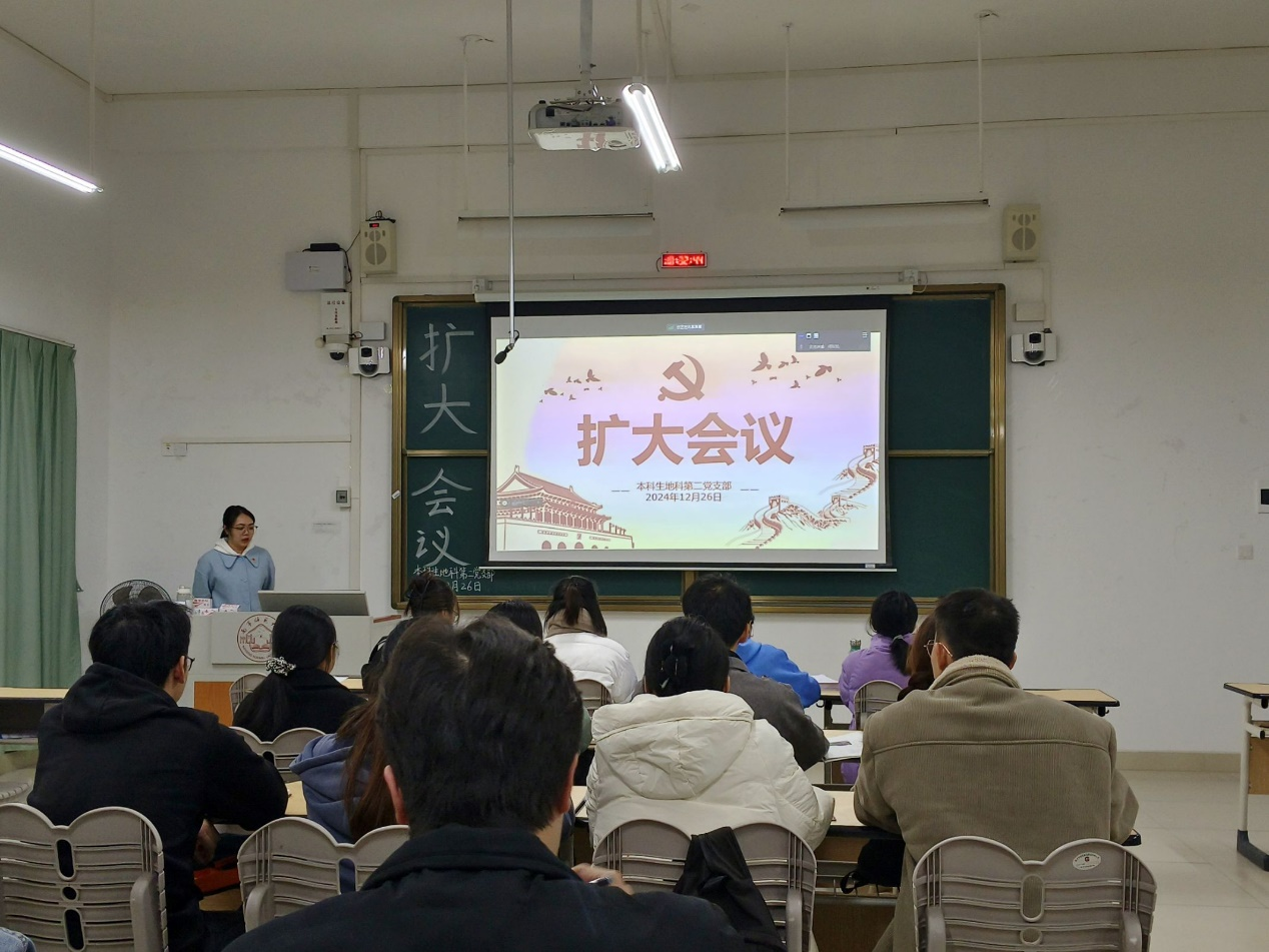 2024年12月26日,williamhill中国官方网站本科生地科第二党支部在武鸣校区1号教学楼120教室召开2024下半年扩大会议。本次会议由支部组织委员黄小同志主持,支部全体成员参会。