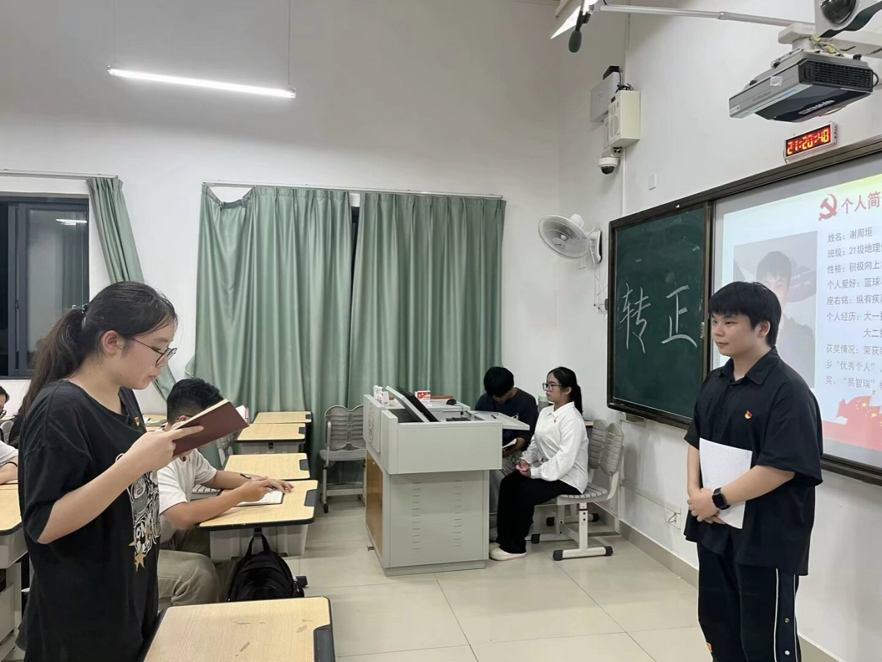 本次会议主要讨论莫映莹等11位中共预备党员的转正事宜。会议伊始,转正申请人依次宣读转正申请书,汇报自身在预备考察期间各方面的情况。随后,韦宗榜同志宣读民意调查结果,其他与会同志结合各转正申请人的发言进行提问,或就其考察期间的综合表现进行总结与评价。提问评价环节结束后,转正申请人从思想、实践、规划三方面进行自我总结,并表达出对如期转为正式党员的坚定意愿。最后,与会正式党员进行无记名投票表决。