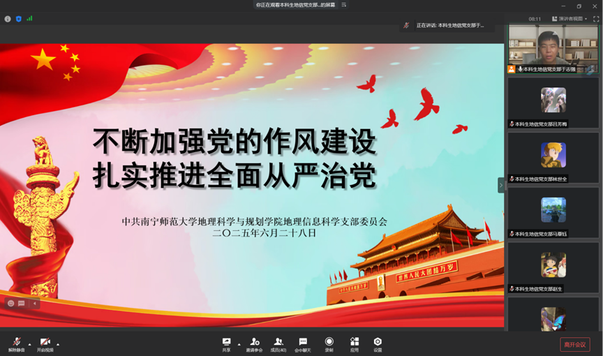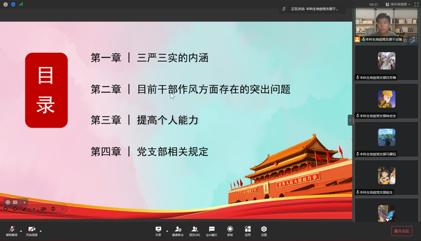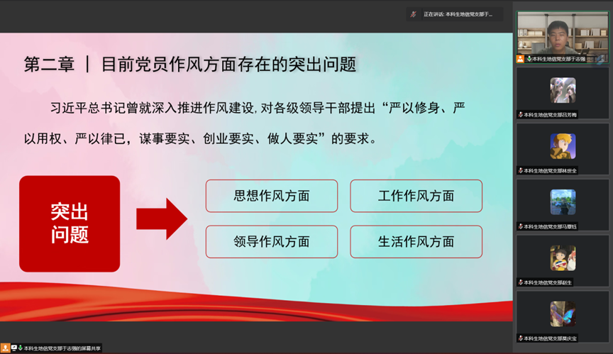 6月28日,williamhill中国官方网站本科生地信党支部于线上开展“不断加强党的作风建设,扎实推进全面从严治党”专题党课学习。此次党课由党支部书记于志强同志主持,支部全体党员共同参与。