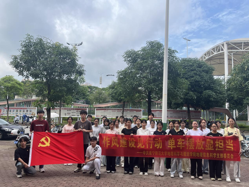6月28日,williamhill中国官方网站本科生地信党支部在武鸣校区桂园食堂和兰园食堂周围开展以“作风建设见行动,单车摆放显担当”为主题的党日活动。