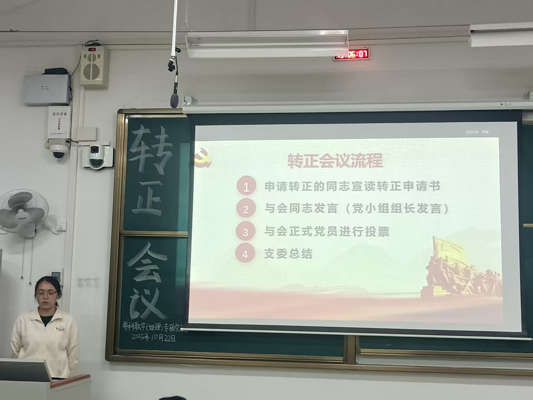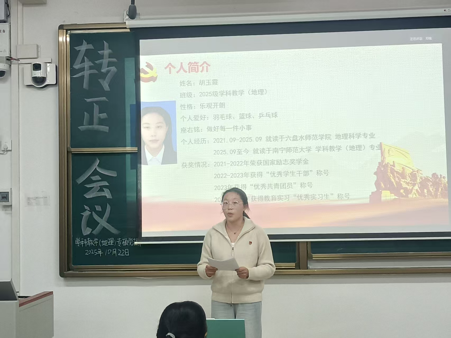 10月22日,威廉希尔中文官网williamhill中国官方网站学科教学(地理)专业硕士党支部党员大会在武鸣校区一号教学楼412教室召开,主要讨论并审议胡玉霞同志预备党员转正事宜。支部应到会有表决权党员45名,实到会有表决权党员44名,符合规定人数。大会由组织委员黄小同志主持。