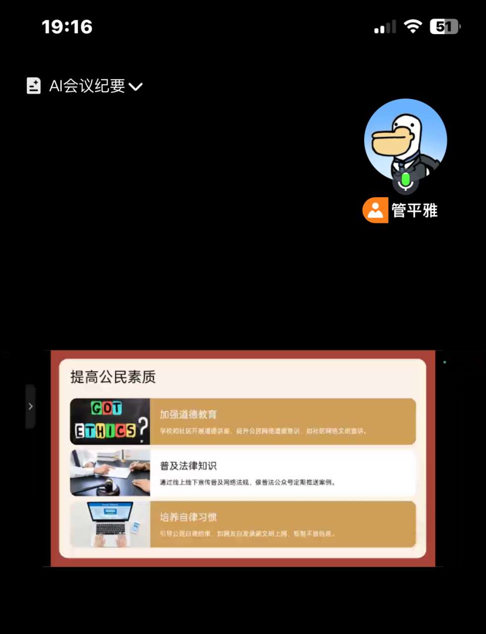 此次会议以“规范网络言行·你我同行”为主题。会议伊始,管平雅同志聚焦党支部及党员网络言行规范问题查摆,带领全体党员依次结合2025年春季学期在学习、工作及日常网络互动中的具体表现,深入开展剖析。随后,管平雅同志作总结发言。她强调,网络空间是新时代党群联系的重要纽带之一,规范网络言行是践行初心使命的具体体现,是维护党组织形象的有力保障。针对部分同志存在的“重表达轻引导”“重速度轻核实”等倾向性问题,她呼吁全体党员要筑牢思想防线,在网络发声中既做“发声者”更做“守门人”,既讲“有态度”更讲“有温度”,既重“传播力”更重“引导力”。最后,她特别指出,全体党员要以“无悔青春”的担当精神,将规范网络言行的要求融入日常、抓在经常,让每一次网络互动都成为传播正能量、彰显党性的窗口。