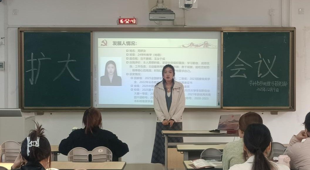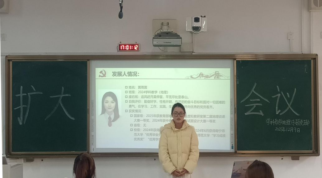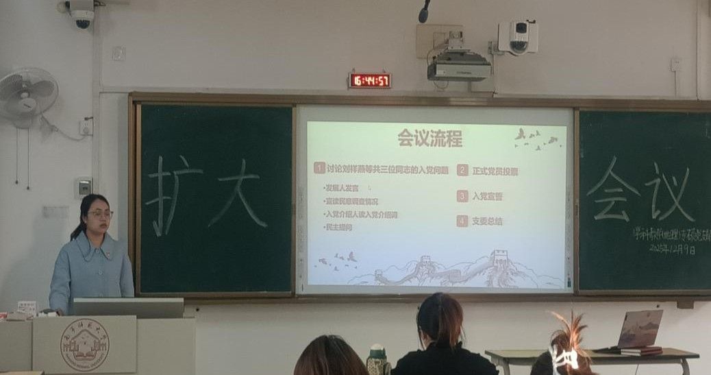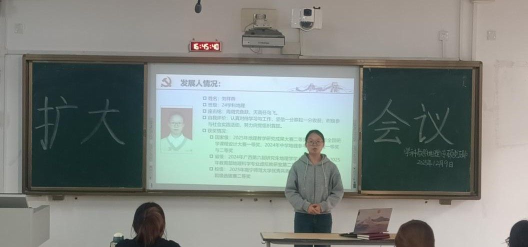 12月10日,williamhill中国官方网站学科教学(地理)专业硕士党支部在武鸣校区1号教学楼201教室顺利召开2025年下半年扩大会议。此次会议由党支部组织委员黄小主持,党支部39名党员(含预备党员)共同参加。